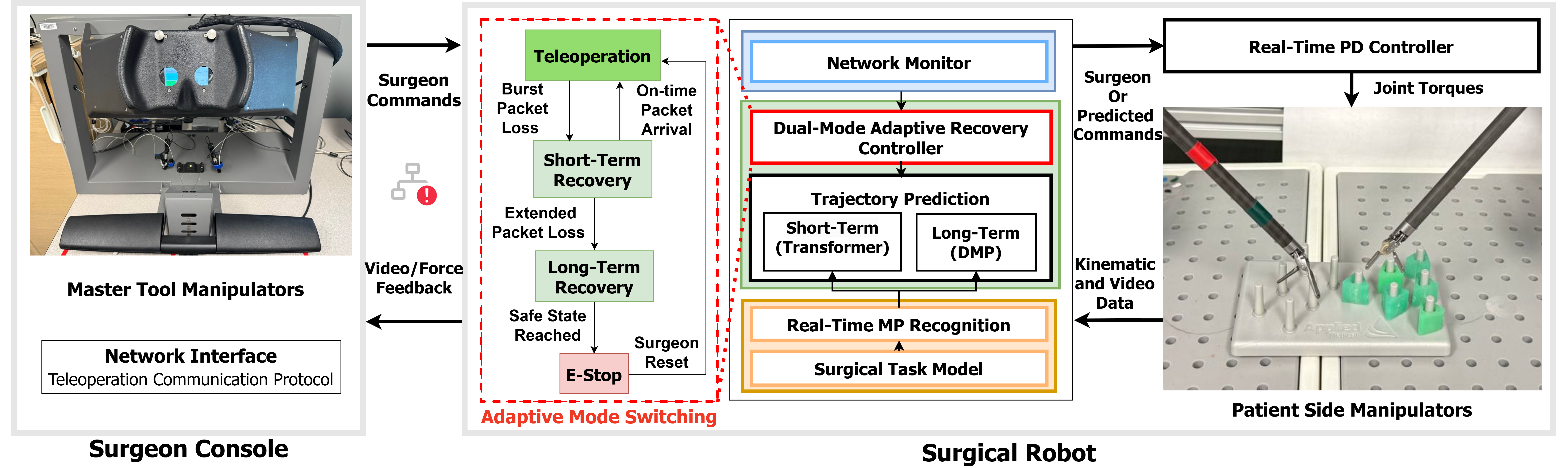 This paper proposes a dual-mode recovery framework that predicts surgeon commands during short disruptions and autonomously completes the current subtask during prolonged communication loss.